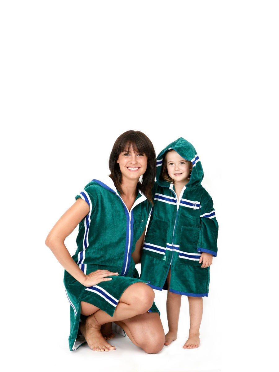 Our deluxe swim robes are for swimmers that swim all year round and value warmth out of the ware! These swim robes are especially perfect for swimming in winter. Our swim robes do an amazing job and warming, drying and protecting precious skin from the sun.