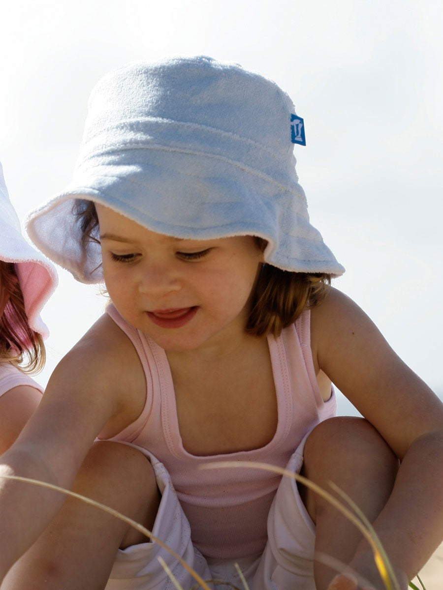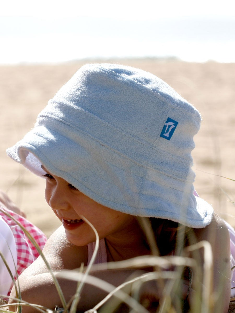 These cute and practical kids beach hats in soft terry will protect those little faces from the hot Summer sun. Very comfortable and designed to stay on.