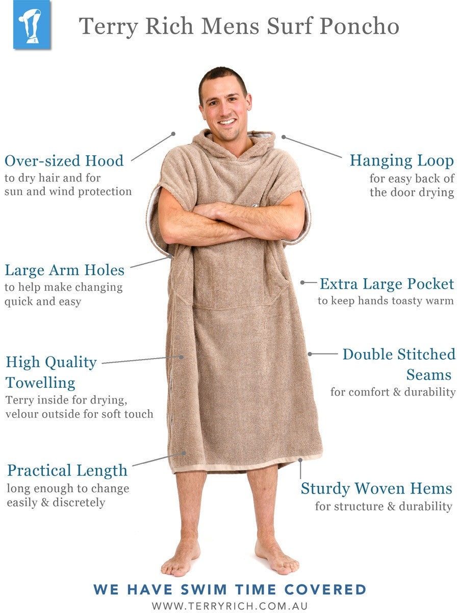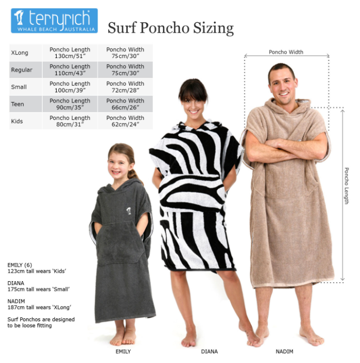 Surf Poncho Features include: – Extra thick 100% cotton towelling fabric that is soft, extra warm & super absorbent. – Clever design with large, easy access arm holes making changing quick & easy. – Luxurious oversized hood that will dry your hair plus keep out sun & wind. – Large Kangaroo pockets to hold your accessories plus to keep hands warm in the cold & wind. – Easy to take anywhere with you. To the beach, the pool, the boat or the lake. Keep in the car – Built to last with superior towelling, fully covered seams & quality finishing. – Easy care. Fully machine washable.