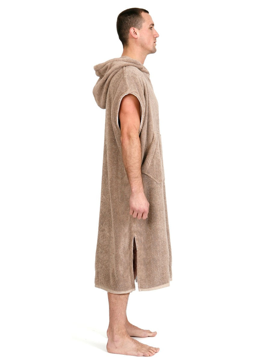 A beautiful quality changing robe that allows you to cover-up discretely when changing in public. No need for clumsy towel stumbling behind cars & trees while trying to get in and out of swimwear and wetsuits. Plus they are expertly cut and styled to look fantastic on. This poncho is super warm, made from extra thick 100% cotton towelling.