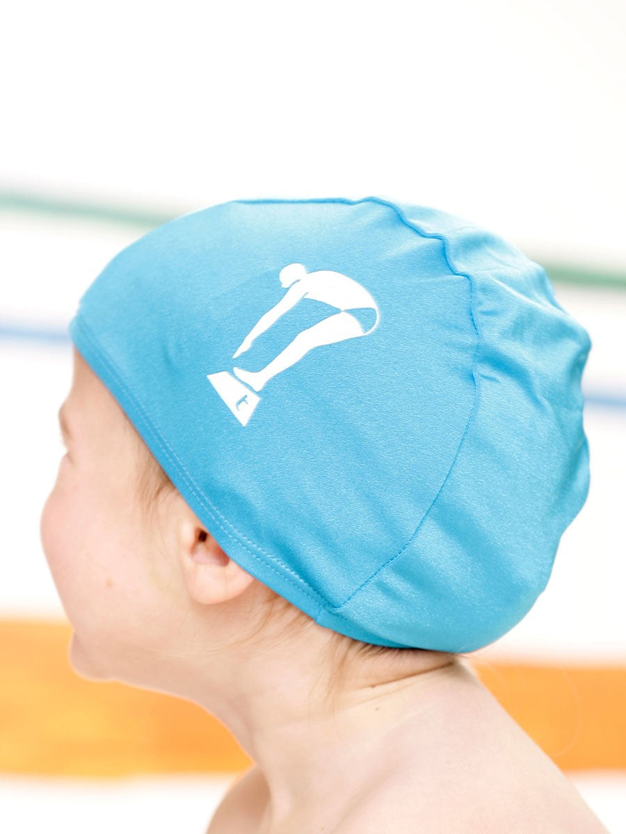 Childrens one size. This Lycra swim cap in bright blue with white print.