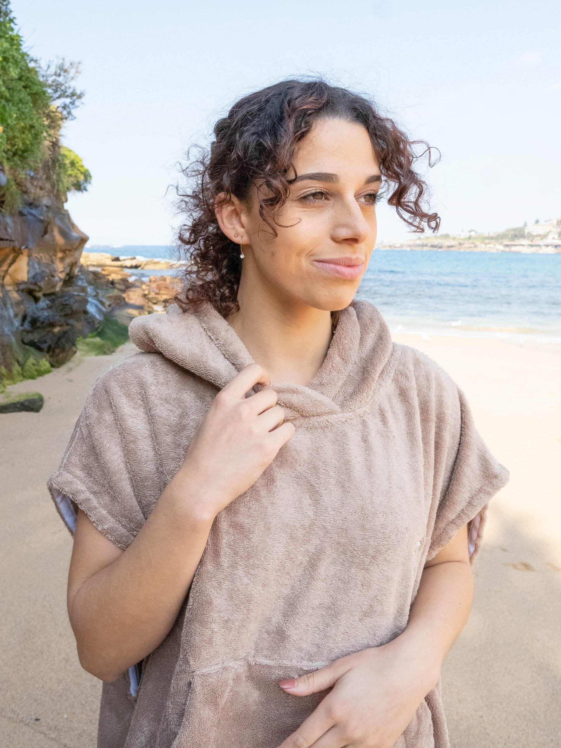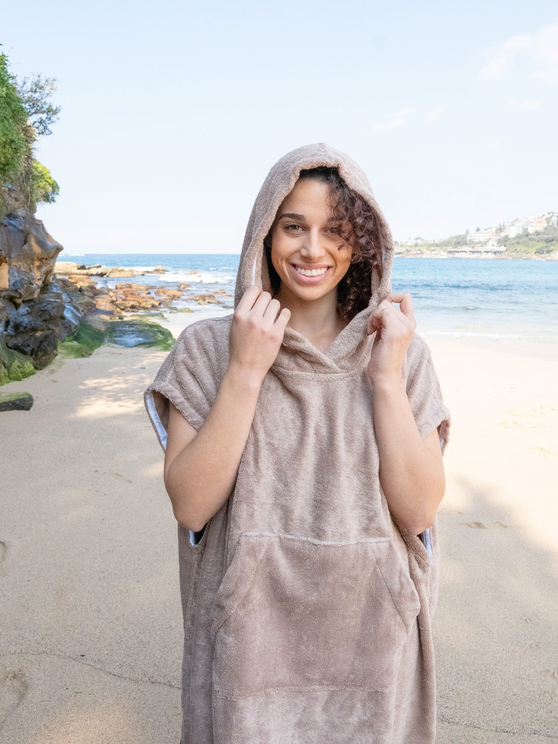 A beautiful quality changing robe that allows you to cover-up discretely when changing in public. No need for clumsy towel stumbling behind cars & trees while trying to get in and out of swimwear and wetsuits. Plus they are expertly cut and styled to look fantastic on. This poncho is super warm, made from extra thick 100% cotton towelling.